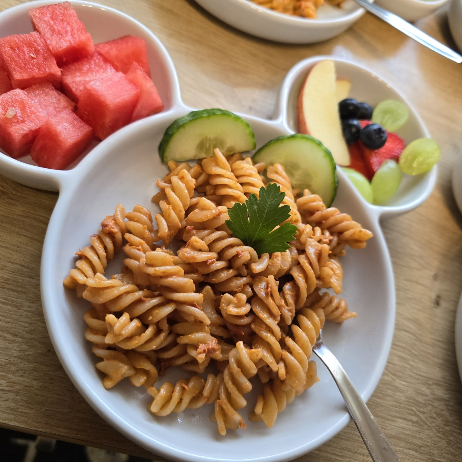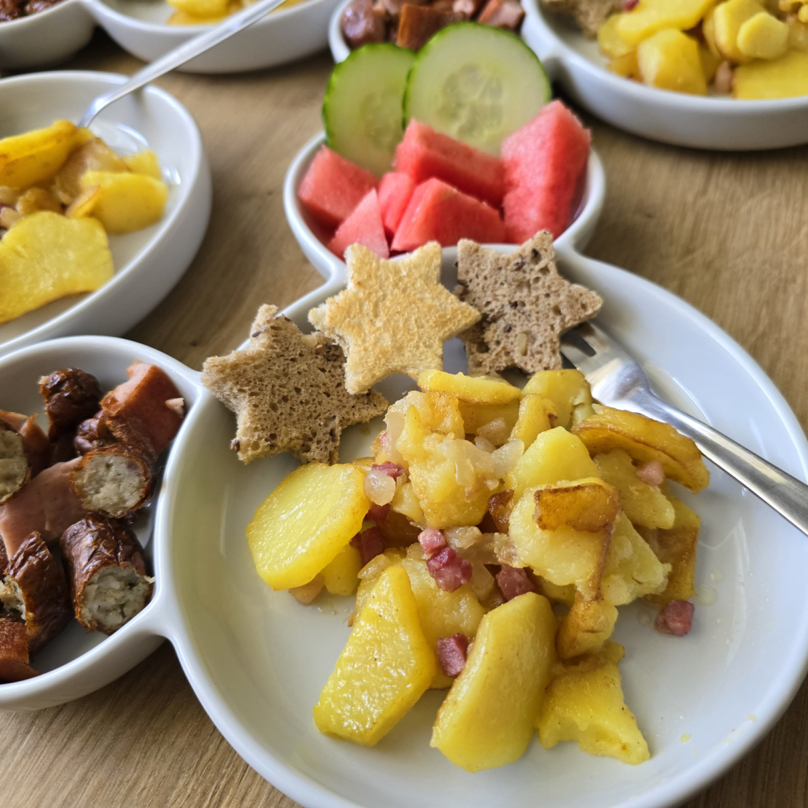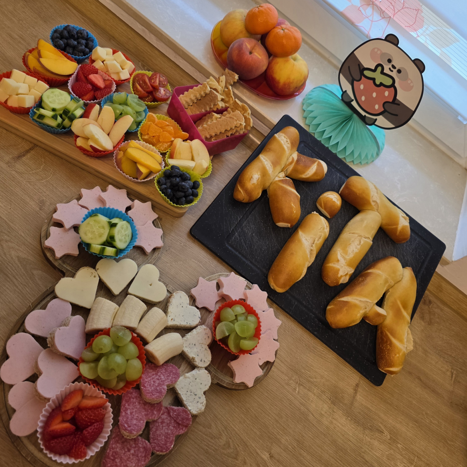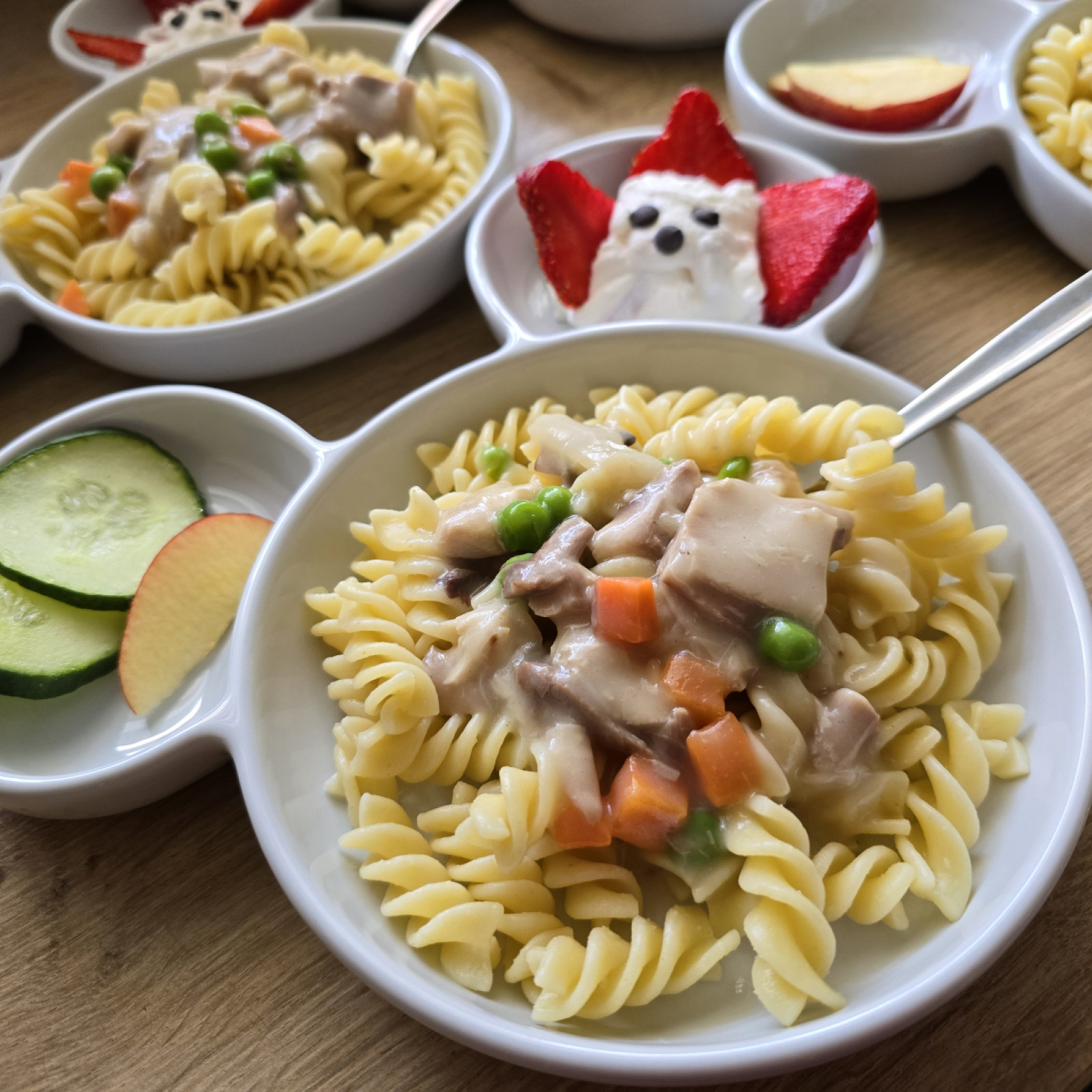 Jedes Kind entscheidet selbst, wie viel es essen möchte, und nimmt sich die Zeit, die es dafür benötigt. Süße Aufstriche oder besondere Mittagsgerichte gibt es nur zu besonderen Anlässen, wie Geburtstagen. Grundsätzlich lege ich Wert auf eine ausgewogene Mischung aus tierischen sowie vegetarischen und veganen Lebensmitteln und tausche beispielsweise Aufschnitt gerne auch gegen pflanzliche Alternativen mal aus.