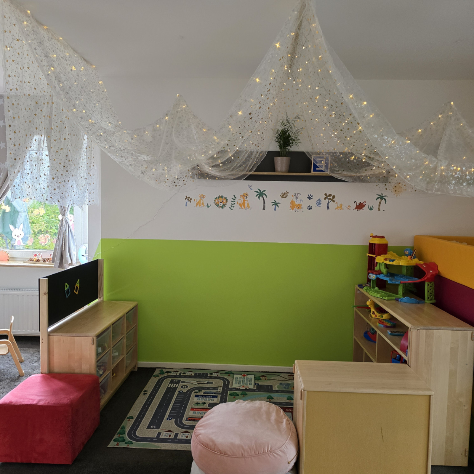 Ein liebevoll eingerichteter, kindgerechter Raum mit einer Fläche von ca. 32 Quadratmetern steht den Kindern als zentraler Spiel- und Schlafbereich zur Verfügung.